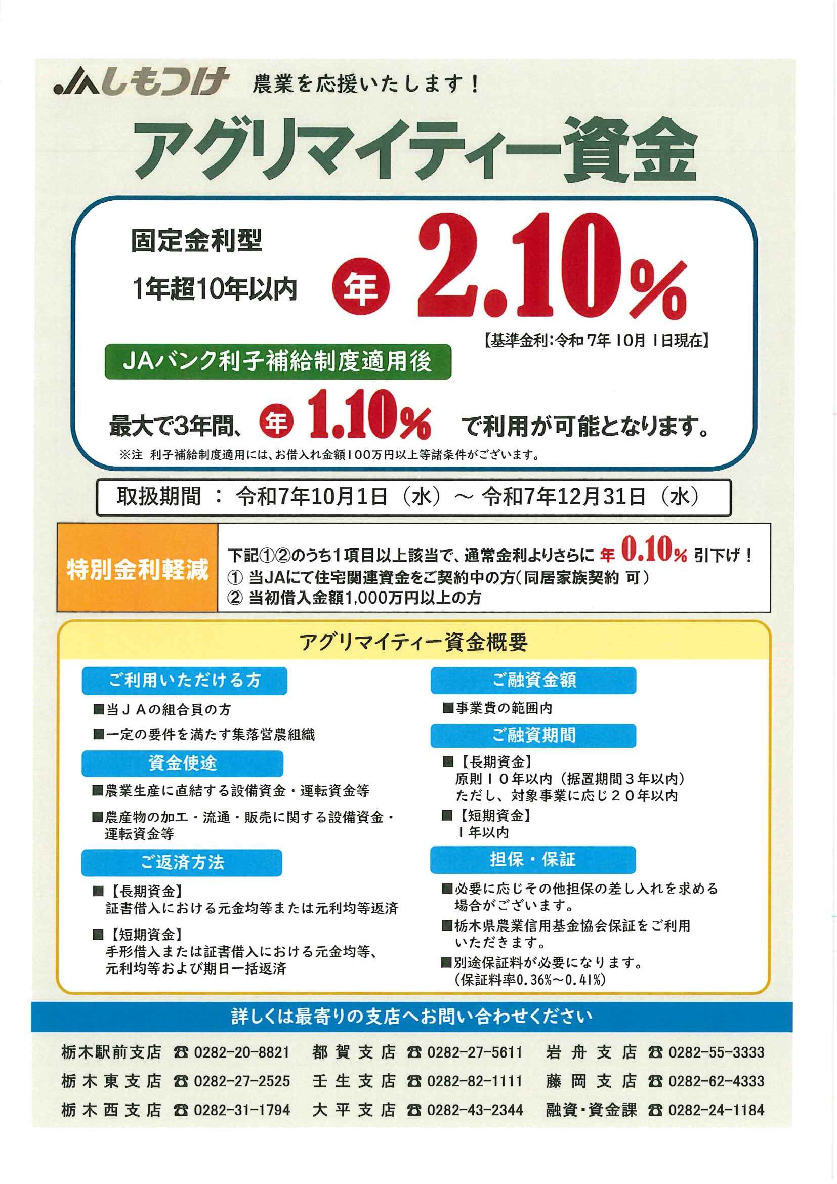 JAバンク 「アグリマイティー資金」のご紹介です 投稿日 : 2025.10.01 カテゴリー : JAバンク この記事のURL : https://www.ja-shimotsuke.jp/news/?p=5644