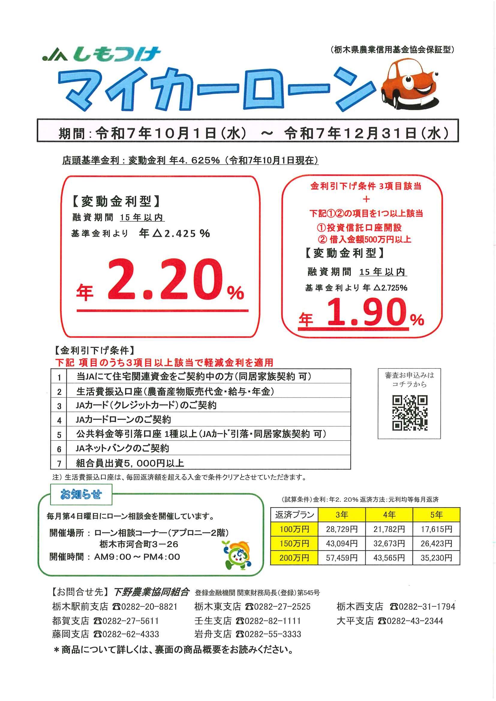 JAバンク 「マイカーローン」の商品情報を更新しました 投稿日 : 2025.10.01 カテゴリー : JAバンク この記事のURL : https://www.ja-shimotsuke.jp/news/?p=5646