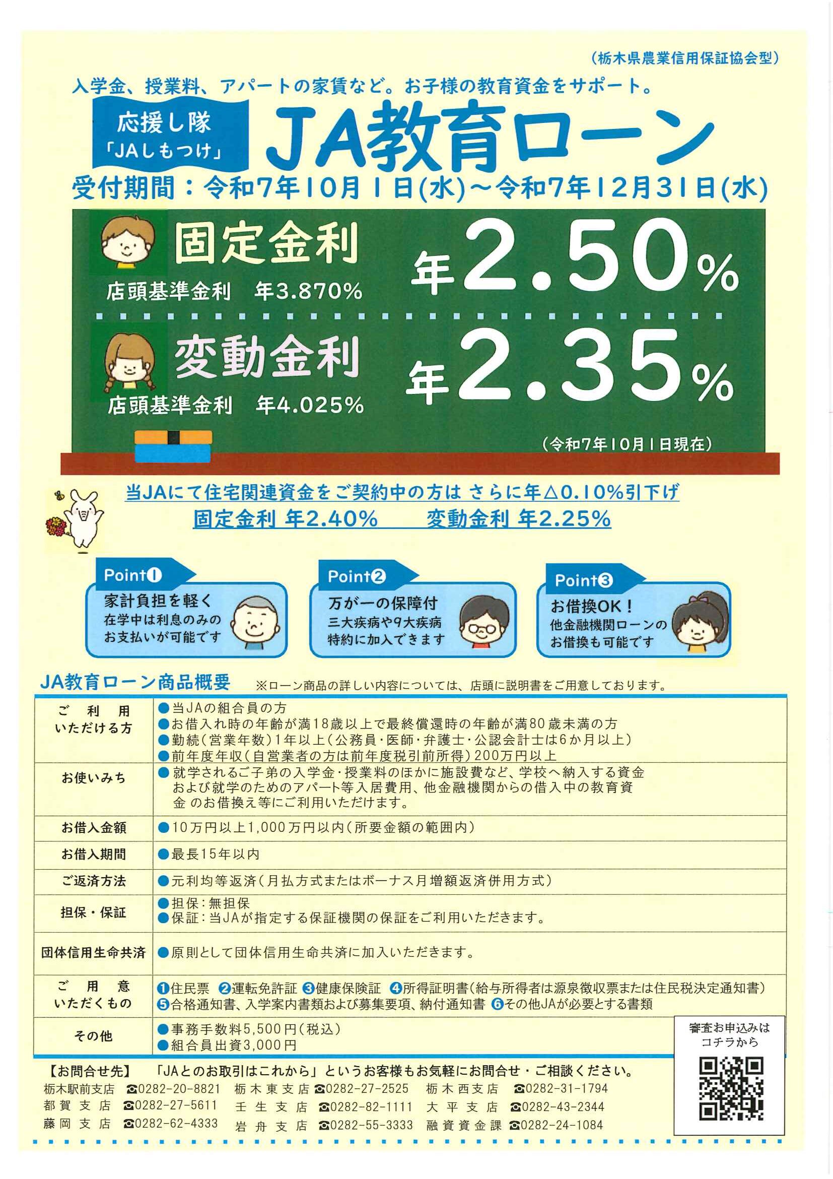 JAバンク 「JA教育ローン」のご紹介です 投稿日 : 2025.10.01 カテゴリー : JAバンク この記事のURL : https://www.ja-shimotsuke.jp/news/?p=5652