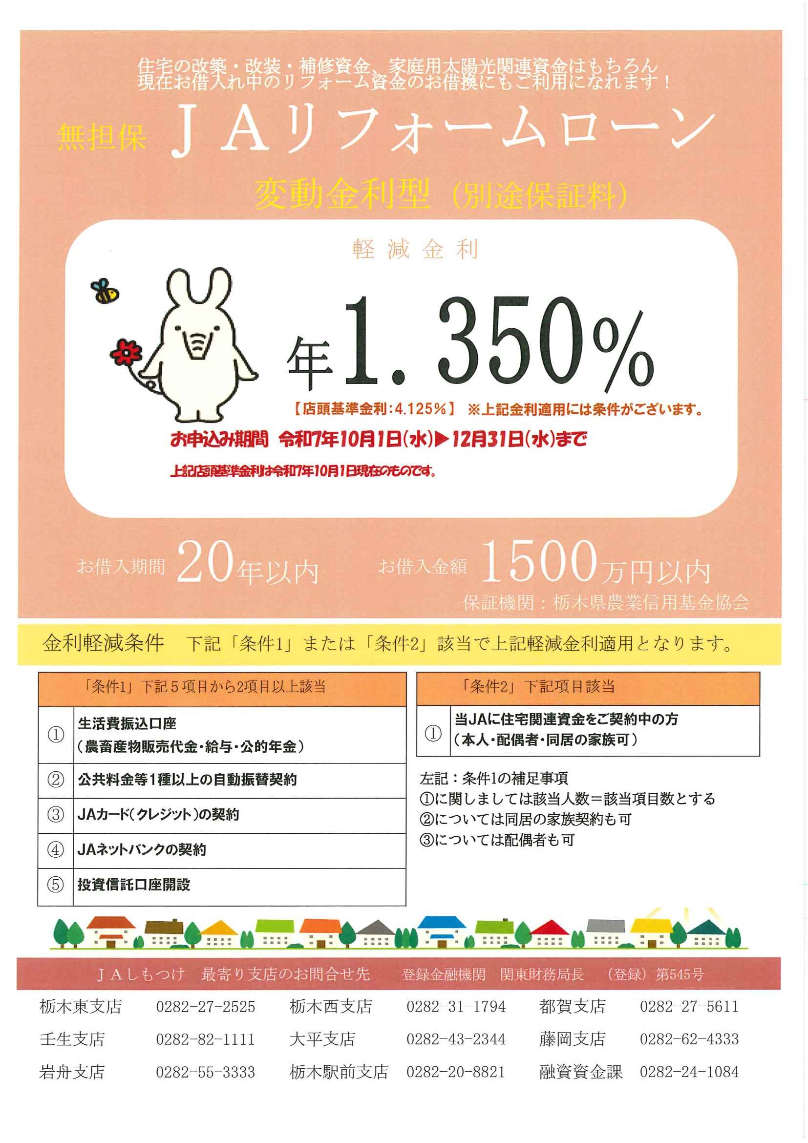 JAバンク リフォームをお考えの方に JAのリフォームローン 投稿日 : 2025.10.01 カテゴリー : JAバンク この記事のURL : https://www.ja-shimotsuke.jp/news/?p=5654