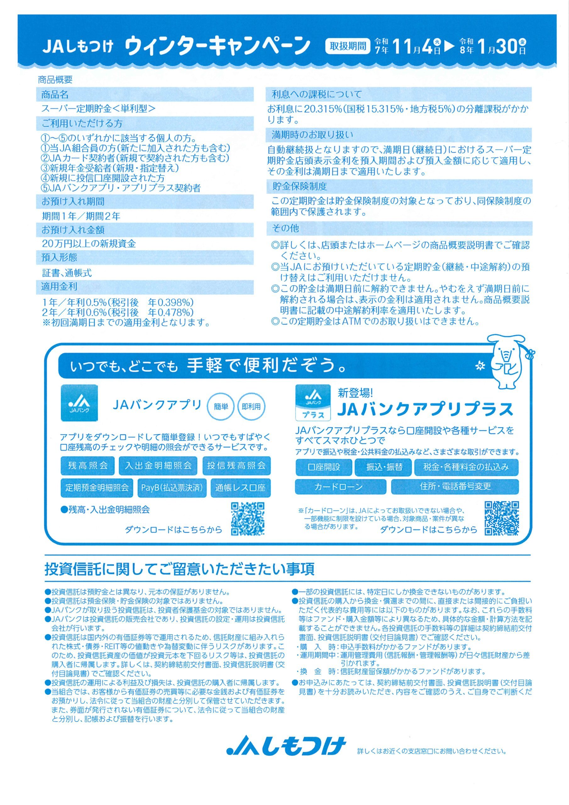 JAバンク 金利上乗せ定期貯金「ウィンターキャンペーン」のご案内です 投稿日 : 2025.12.11 カテゴリー : JAバンク この記事のURL : https://www.ja-shimotsuke.jp/news/?p=5737