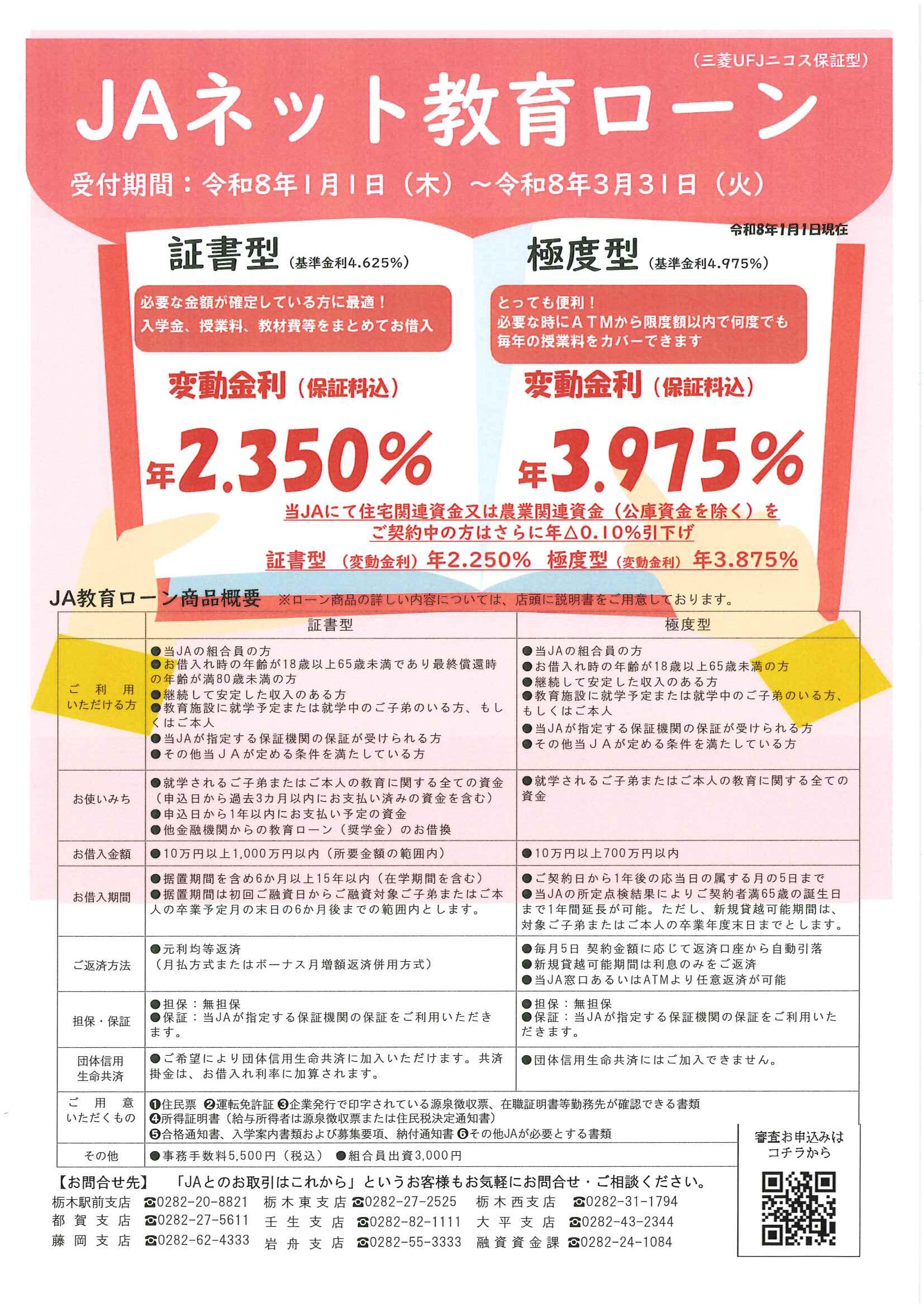 JAバンク 「JAネット教育ローン」のご紹介です 投稿日 : 2026.01.01 カテゴリー : JAバンク この記事のURL : https://www.ja-shimotsuke.jp/news/?p=5783
