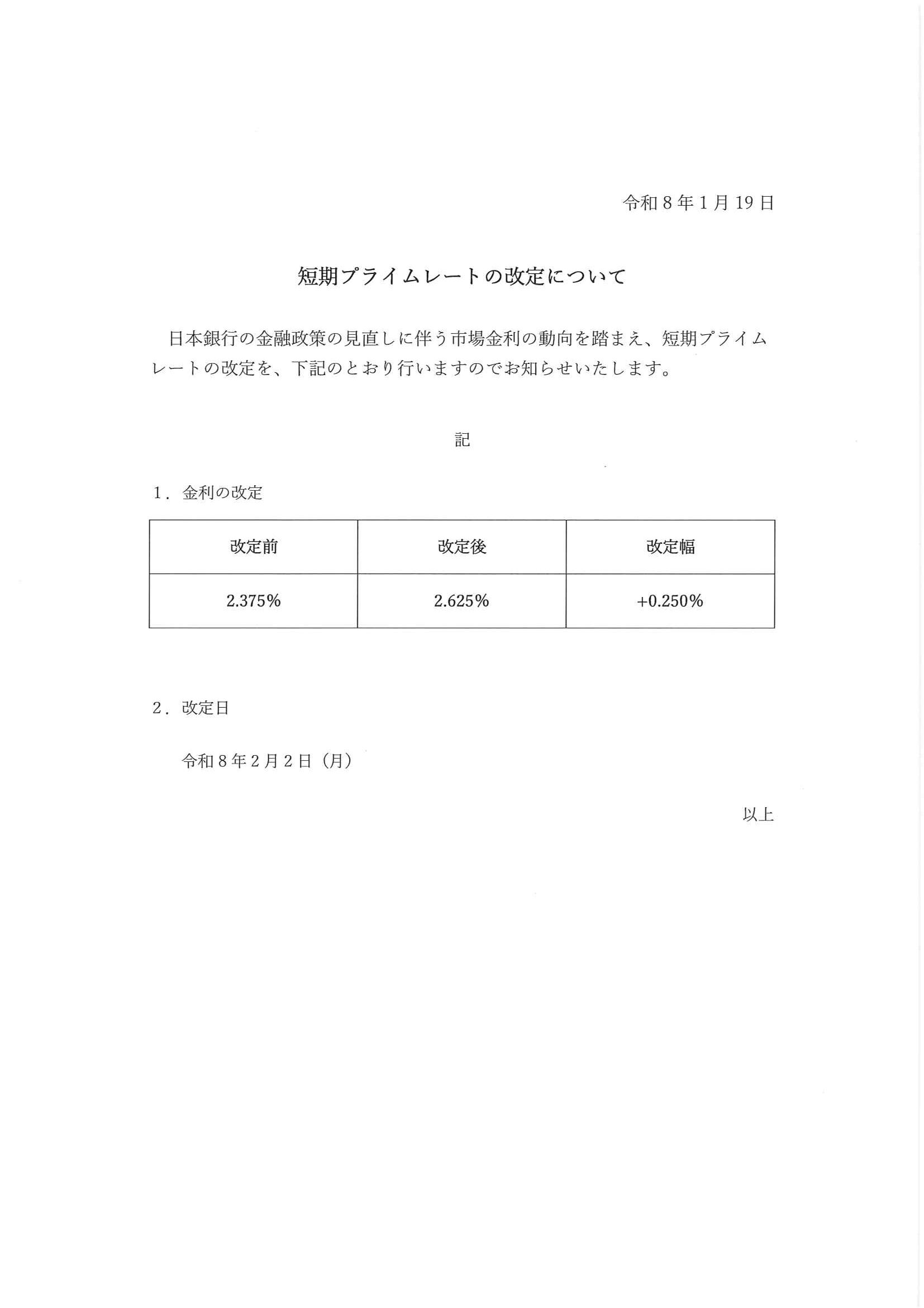 JAバンク 短期プライムレートの改定について 投稿日 : 2026.01.19 カテゴリー : JAバンク この記事のURL : https://www.ja-shimotsuke.jp/news/?p=5926