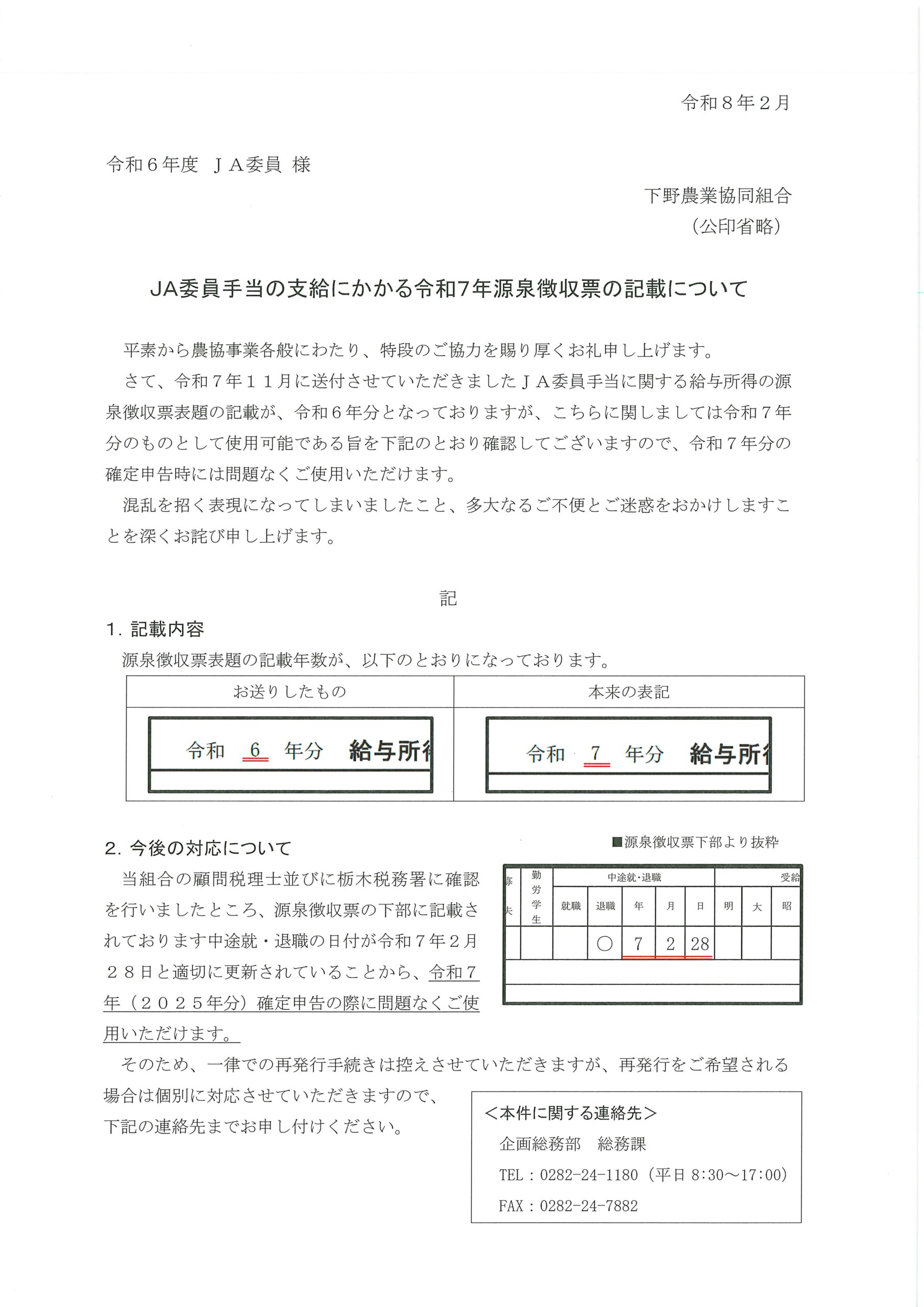 ご利用者の皆様へ JA委員手当の支給にかかる令和7年源泉徴収票の記載について 投稿日 : 2026.01.30 カテゴリー : ご利用者の皆様へ この記事のURL : https://www.ja-shimotsuke.jp/news/?p=5935