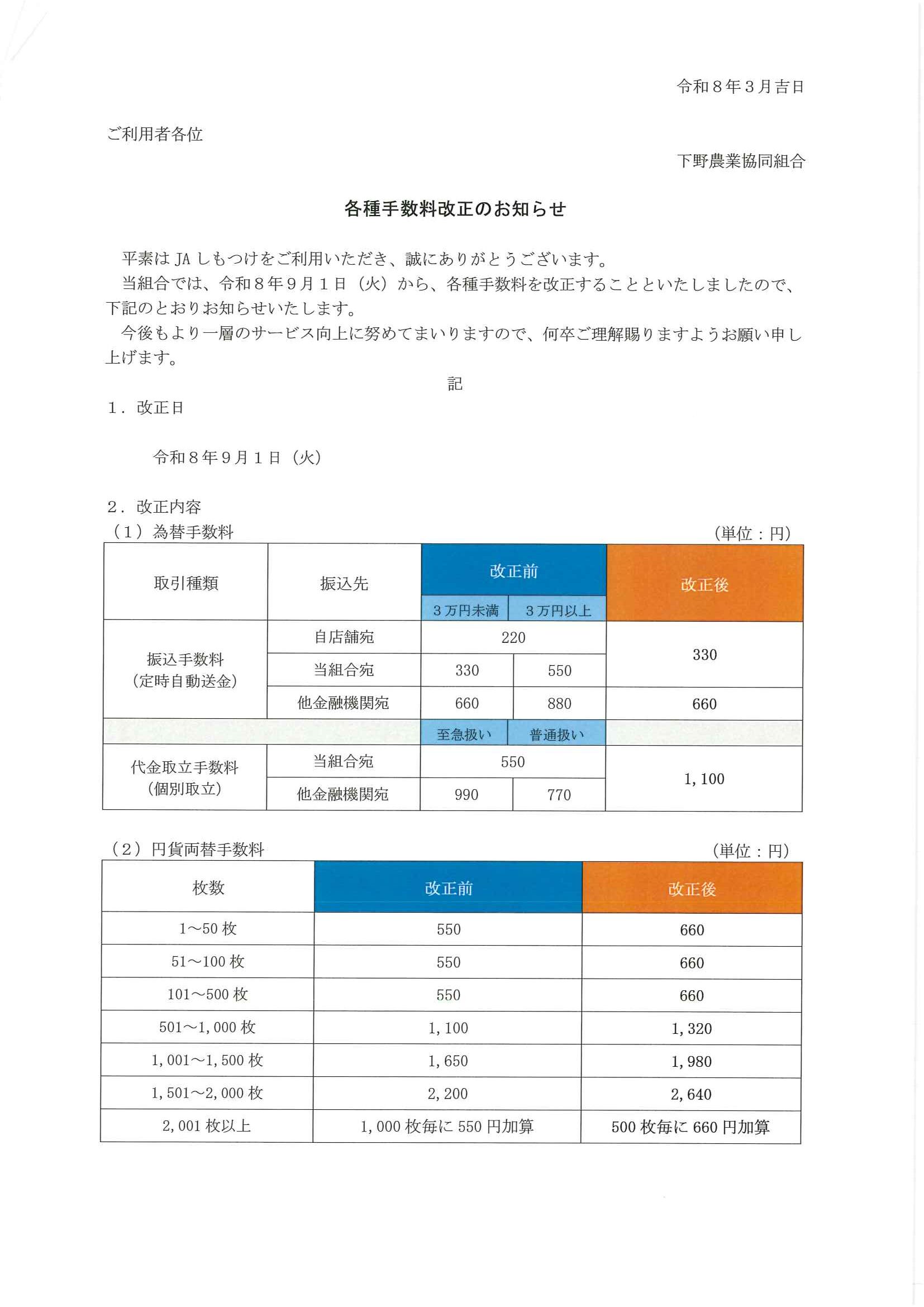 JAバンク 各種手数料改正のお知らせ 投稿日 : 2026.03.02 カテゴリー : JAバンク この記事のURL : https://www.ja-shimotsuke.jp/news/?p=5969