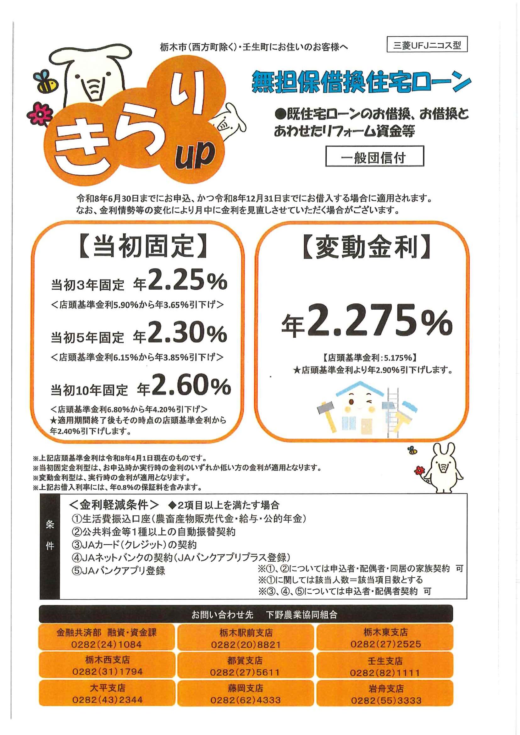 JAバンク 無担保借換住宅ローン「きらりup」のご紹介です 投稿日 : 2026.04.01 カテゴリー : JAバンク この記事のURL : https://www.ja-shimotsuke.jp/news/?p=6009